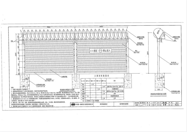3、围栏立柱、支架、网片、边框、连接板采用连续热浸镀锌浸塑复合涂层,铁丝、刀片滚笼、螺栓采用热浸镀锌涂层,所有钢材均采用Q235低碳钢,具备抗腐蚀、抗紫外线能力,使用寿命不低于15年。
