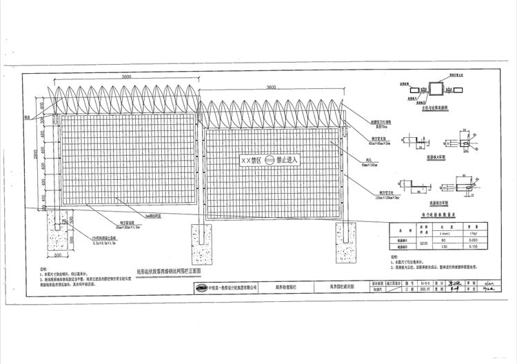 2、围栏立柱及钢框网采用绿色,单元尺寸为长3.6米,高2.8米;钢方管立柱120mm*120mm*3mm,端头封闭,钢方管边框50mm*30mm*1.5mm,钢丝网筋直径3mm,网孔80mm*150mm,钢立柱顶部焊接两根40mm*40mm*3mm钢方管作为支架,钢方管朝两侧弯成Y字型,端头封闭,在支架上端左右两侧及底端各拉设一根12号铁丝作为纵向拉筋,并在铁丝上安装直径70cm的蛇腹型刀片滚笼(详《刺丝滚笼设计图》),用12号铁丝绑扎牢固。