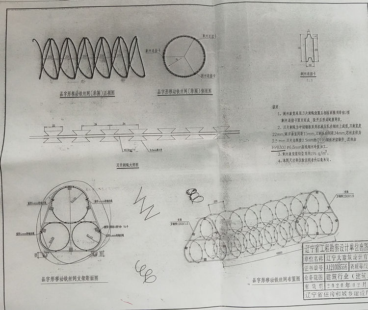 2、刀片刺绳为冲切钢板采用机械压轧在钢丝上成型,刀刺宽度22mm,两刃垂直间距15mm,刀刺纵向间距34mm,芯丝直径为2.5mm。刀片为厚度0.5mm的Q195钢板冲切制作,芯丝由HPB300Φ6.5mm高线钢丝冷拔加工。