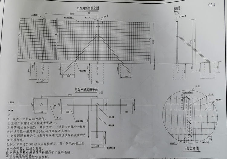 3、电焊网隔离栅立柱间距2m,端头立柱、一组纵向斜撑和一道横向斜撑间距一般路段为20m,特殊路段适当加密。