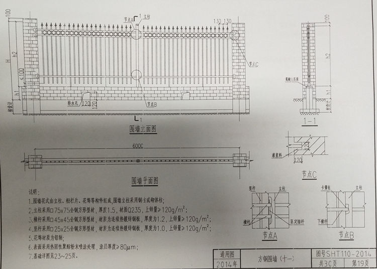 1、围墙花式由立柱、栅栏片、花饰等构件组成,围墙立柱采用钢柱或砌体柱。