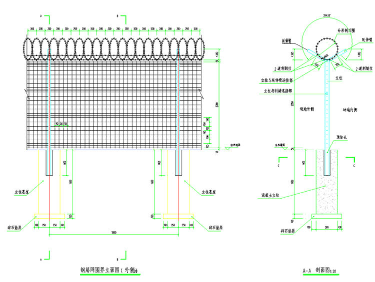 7、图中立柱顶部应加盖柱帽,立柱与钢筋网、立柱与延伸臂的连接采用防盗形式并经防腐处理。