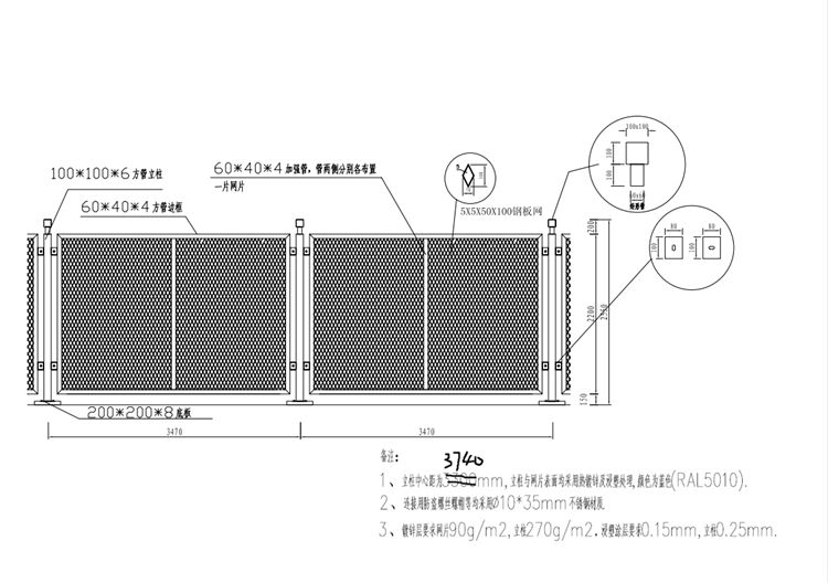 1、停车场围栏立柱中心距为3740mm,立柱与网片均采用热镀锌及浸塑处理,颜色为蓝色(RAL5010)。