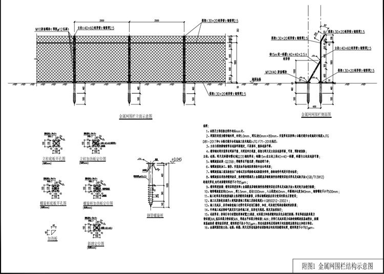 2、金属网围栏类型为镀锌钢丝网,丝径5.0mm ,网孔为80mmx80mm.安装要求应按照《公路交通安全设施设计规范》JTGD81- 2017和《公路交通安全设施施工技术规范》JTG F71-2018执行。