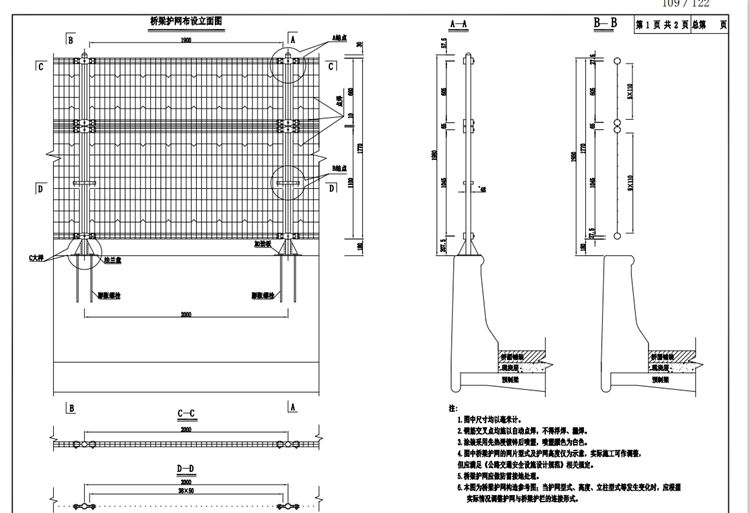 6、本图为双圈护栏网构造参考图,当双圈护栏网型式、高度、立柱型式等发生变化时,应根据实际情况提走恶化那个双圈护栏网与桥梁护栏的连接形式。