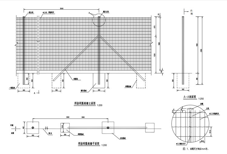 全线除天然屏障处(河流、沟渠等),其余地方(包括旱桥部分)均连续设置结构合理、美观大方的焊接网隔离栅。焊接网隔离栅适用于互通式立交、服务区和沿线蒸发池等重点路段等范围内。焊接网隔离栅应设在路基两侧用地界碑内0.3米处,地形有起伏时,焊接网隔离栅按阶梯形设置;焊接网隔离栅遇到≤3米的沟渠或涵洞时,可采用直接经过;每段焊接网隔离栅的起终点或焊接网隔离栅需要断开的地方,应针对不同的情况做端头围封,在焊接网隔离栅需改变方向的地方,应做拐角处理。焊接网隔离栅基础预制施工。为满足公路、桥梁和通道等养护管理的需要,可在适当位置设置便于开启以满足车辆或人员进出的焊接网隔离栅活动门,焊接网隔离栅的立柱需要根据活动门的大小和开启情况进行加强。焊接网隔离栅的钢构件均应做热浸镀锌防腐处理。镀锌时应符合下表的规定,热浸镀锌所用的锌应为符合《高速公路交通工程钢构件防腐技术条件》中引用的GB/T470中所规定的0号或1号锌锭。镀锌后再镀塑,颜色为果绿色。