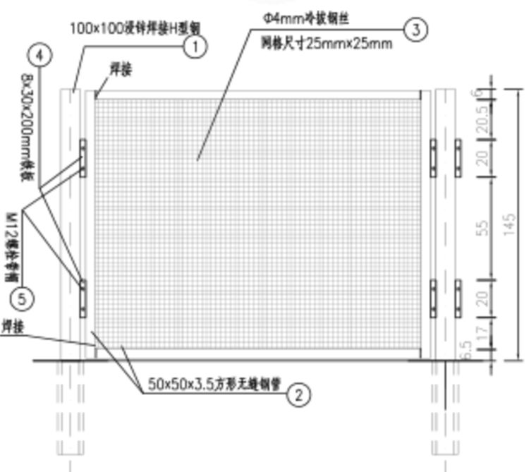 5.桥梁外侧防落物网底空及网片与立柱间空隙不大于3厘米,网片钢丝直径不小于4毫米,网片孔径不大于25x25毫米。钢丝要求冷拔状态,网片采用浸锌浸塑防腐处理,桥梁外侧防落物网上加挂安全警示标志。