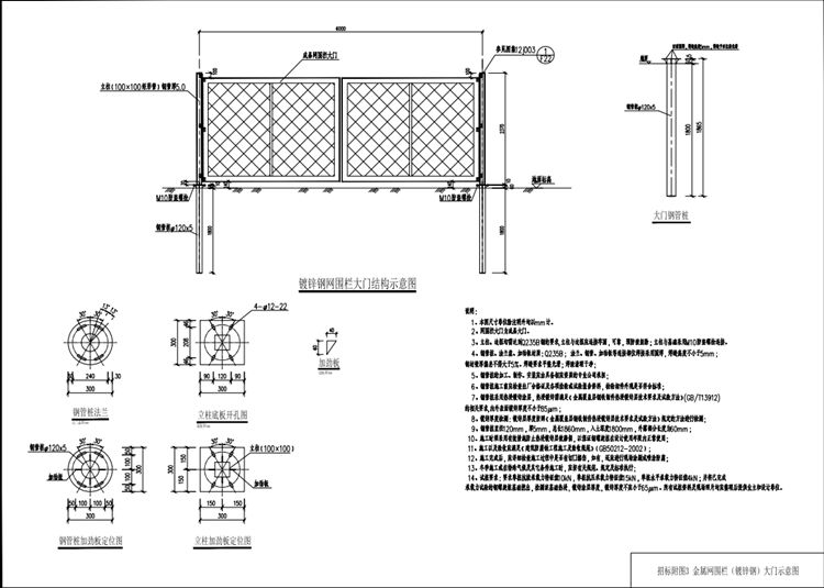3.镀锌钢网围栏大门立柱、边框均需达到Q235B钢的要求,立柱与边框应连接牢固,可靠 ,预防被拆除;立柱与基础采用M10肪盗螺栓连接。