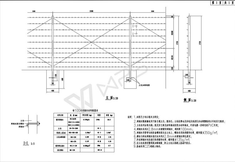 4.剌钢丝采用Φ2.8mm丝梗镀锌剌钢丝,刺间距100mm。