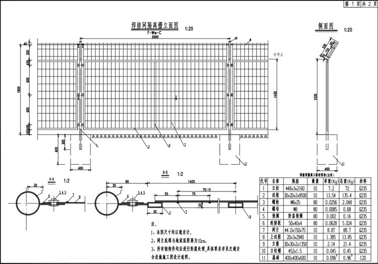 本设计新增的互通立交采用焊接网,焊接网隔离栅由网片、立柱等构件组成,现场连接,隔离栅基础均采用C20号混凝土预制,预留孔洞用10#水泥沙浆填充。