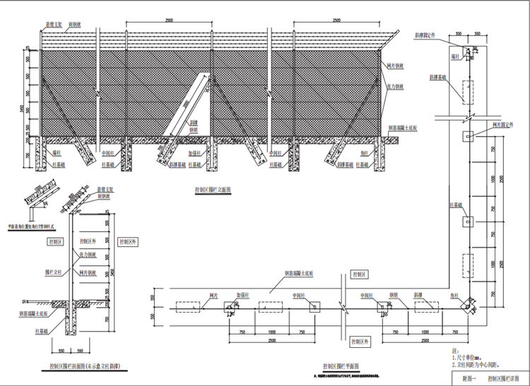 立柱包括端柱、角柱、加强柱和中间柱,均采用Q235B级钢。端柱、角柱和加强柱采用80mmX80mmX3mm方管立柱,中间柱采用90mmX50mmX3mm矩管立柱。立柱的任一截面,其平行于围栏轴线的截面模数应大于15cm3。 立柱总高度为3.45m,每根立柱均应埋入混凝土基础中0.9m。柱间距为2.5m,两根加强柱之间的距离不超出50m。端柱、角柱及加强柱应配有斜撑,采用Q235B级钢,规格为L50mmX 5mm,与立柱夹角为30°,总长度为2.7m,应埋入混凝土基础中0.7m。斜撑应安装于网片内侧,通过连接件用螺栓与立柱连接。每根立柱上应焊接有六个固定件用于固定网片,固定件的距离应与网片张力钢丝之间的距离相匹配,固定件的大小应能满足固定网片的要求。立柱、斜撑和固定件均应进行防腐处理。采用双涂层,内层为金属镀层,立柱和斜撑单面平均锌层质量不小于280g/㎡,固定件单面平均锌层质量不小于120g/㎡;外层为聚酯粉末涂层,涂塑层厚度不小于0. 08mm,涂层颜色为墨绿色(色卡号:RAL 6005)。