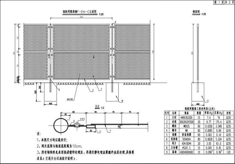 考虑到改扩建期间隔离栅临时围避利用的因素,本设计中一般路段主要采用了钢板网型式,对风景区、旅游区、著名地点、水源保护区等区段采用钢板网隔离栅。钢板网隔离栅由网片、边框、立柱等构件组成,现场连接。为方便道路养护人员的进出,在大桥、特大桥桥台处隔离栅设置检修门。隔离栅基础均为C20号混凝土。