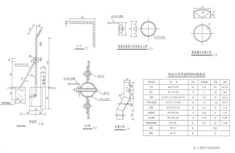隔离栅的主要作用是将公路用地隔离出来,同时将可能影响交通安全的人和畜等与高速公路分离开来,从而确保行车安全、排除横向干扰、充分发挥公路功能、保证高速公路的正常运营。设置隔离栅的目的是防止行人或与高速公路无关人员随意穿越高速公路,避免牲畜或其它动物进入高速公路,防止意外事故的发生。其具体布设原则是:(1)本项目沿线路况,除符合下列条件之一者,其余均应设置隔离设施。1)路侧有水渠、池塘、湖泊等天然屏障,认为将来不用担心有人进入和非法侵占公路用地区段。2)路侧有高度大于1.5m的挡土墙或砌石等陡坎,人、畜不能进入的区段。3)桥梁、通道等构造物,除桥头、洞口需与路堤隔离设施连接封死以外的区段。4)挖方路基边坡垂直挖方高度超过20m且坡度大于70°的路段。(2)隔离栅遇桥梁、通道、车行和1人行涵洞时,应在桥头锥坡或端墙处进行回封。对于行人通过较多的路段,可应择强度高的结构进行围封。(3)隔离栅遇跨径小于2m的涵洞才可直接跨越,跨越处应进行围封, 防止行人和动物误入。(4)隔离栅的中心线应沿公路用地范围界限以内20~50cm处设置。(5)为满足公路、桥梁和通道等养护管理的需要, 可在进出高速公路、 需要控制出人的一级公路的适当位置设置便于开启以满足车辆或人员进出的隔离栅活动门,隔离栅的立柱需要根据活动门的大小和开启情况进行加强。(6)在行人、动物无法误入分离式路基内侧中间区域的条件下,可仅在分离式路基外侧设置隔离栅;在行人、动物可以误入分离式路基内侧中间区域的条件下,宜在分离式路基内侧行人和动物误人的位置设置隔离栅。(7)本项目在大桥、特大桥两侧桥头各设有隔离栅门。