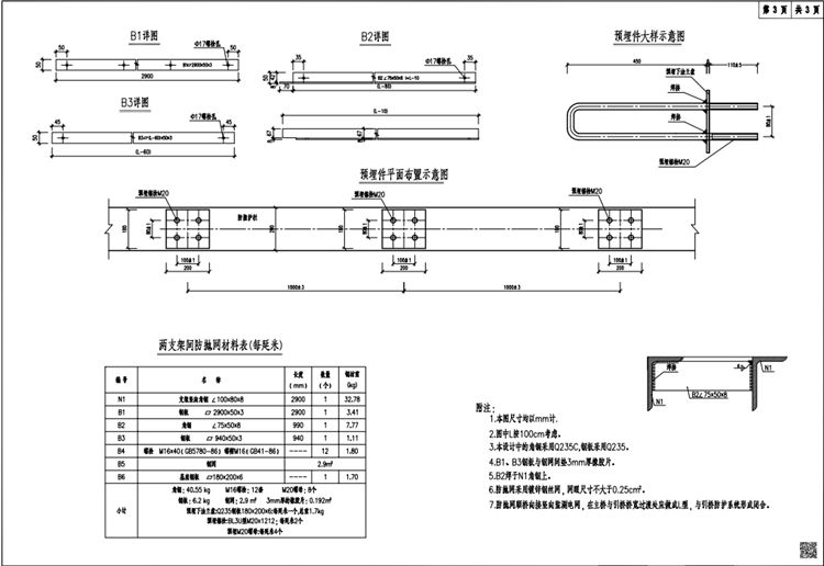 跨高铁特大桥防异物防护网设计要求1.本图尺寸均以mm计。2.图中L按100cm考虑。3.本设计中的角钢采用Q235C ,钢板采用Q235。4.B1、B3钢板与钢网间垫3mm厚橡胶片。5.B2焊于N1角钢上。6.防抛网采用镀锌钢丝网,网眼尺寸不大于0.25平方厘米。7.防抛网顺桥向接竖向监测电网,在主桥与引桥桥宽过渡处应做成L型,与引桥防护系统形成闭合。