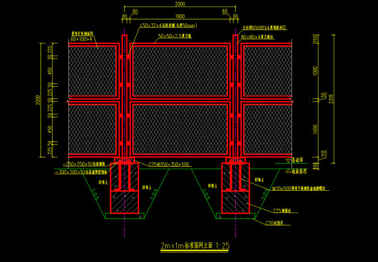 2.围网网面以Q235低碳钢板切割扩张制成,网面与方通应采用面接,接触长度不小于20mm,钢板网尺寸采用长节距100mm,短节距60mm,梗宽4mm,钢板厚4mm,未尽部分详见详见《隔离栅》(GB/T 26941-2011)。