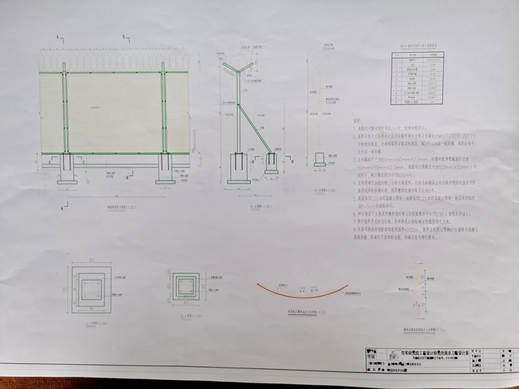 3.立柱截面尺寸为80mmx60mmx2.5mm,斜撑和延伸臂截面尺寸为50mmx50mmx2.0mm,钢筋网片网格尺寸为100mmx50mm (中到中),刺刀圈直径不小于600mm。