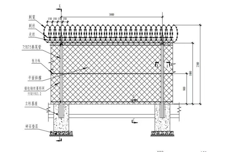 5、铝包钢丝菱形网围网上部安装防攀爬滚刀刺笼,刀刺圈间距150mm,刀刺网材质为镀锌材质。