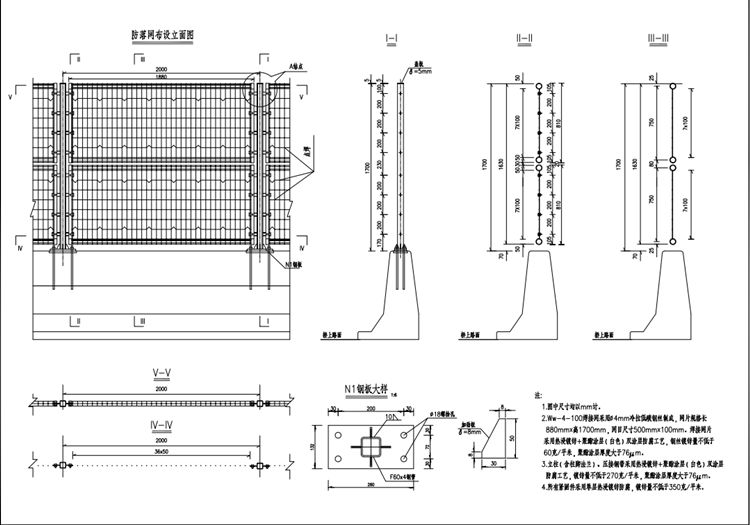 7.本双圈防抛网在分离式立交主线桥、跨越等级公路的大桥、跨主线的匝道桥、天桥等有预留地脚法兰的路侧防撞墙上设置。