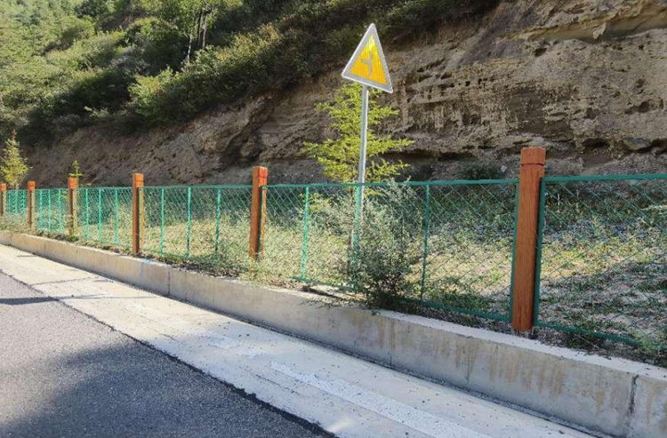 农田防护网基础做法:C25砼立柱基座为300mm*350mm*400mm(砼立柱埋入地下 300mm),基座采用 C25现浇混凝土,基础100mmC15混凝土垫层。为方便村民通行方便,配套防护铁门,规格为1.8m*3m,预埋立柱高 2.1m(重量6.8斤,壁厚2mm,直径48mm),铁门与预埋立柱之间通过焊接连接件用螺丝将其固定。