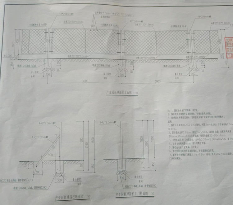 4、围栏立柱采用φ48x2.0mm圆管,间隔3m一个立柱,立柱地面高1.8m,埋深0.39m。