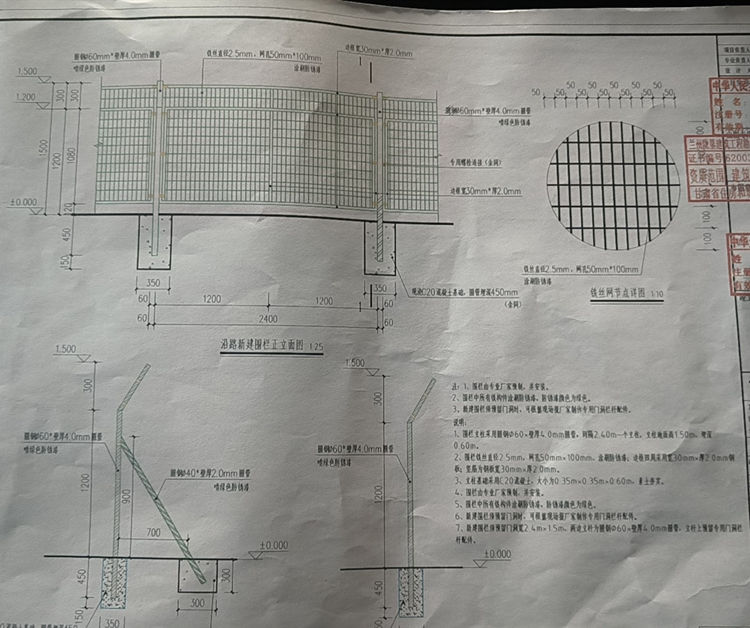 8、沿路铁丝网围栏须预留门洞宽2.4mx1.5m,两边立杆为圆钢φ60x壁厚4.0mm图管,立杆上预留专用门洞栏杆配件。