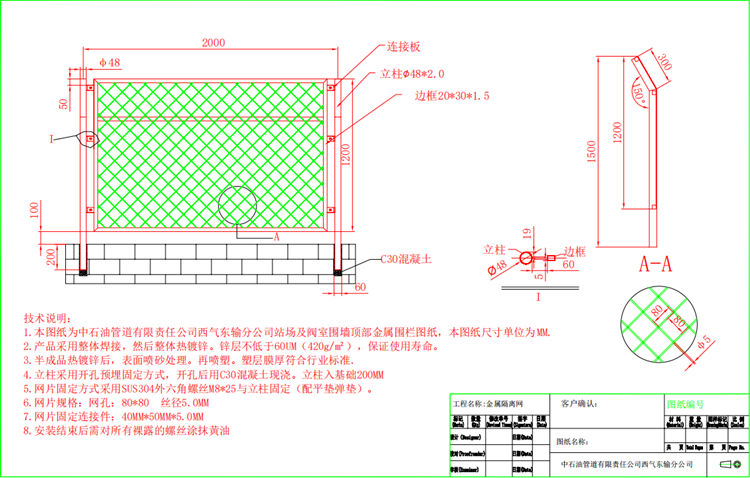 1.本图纸为中石油管道有限责任公司西气东输分公司站场及阀室围墙顶部边框式金属围栏图纸,本图纸尺寸单位为MM。