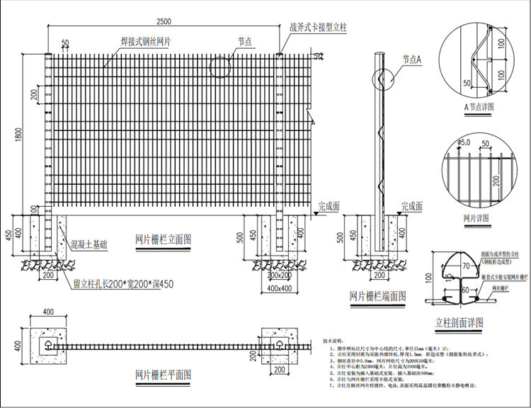 1、图中网片栅栏所标注尺寸为中心线的尺寸,单位以mm (毫米)计。