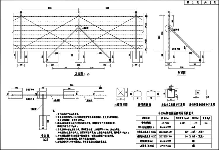 6.刺钢丝隔离栅立柱基础采用C30预制混凝土,斜撑基础为C30现浇素混凝土。