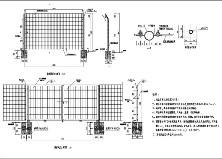 6.钢丝网围栏基础用C30素混凝土现浇,浇筑前需将基础底土层充分压实,压实系数0.94,回填土不得使用淤泥、淤泥质土、耕土及有机物含量大于8%的土。地基承载力特征值fak≥150kPa , E≥4.0MPa。