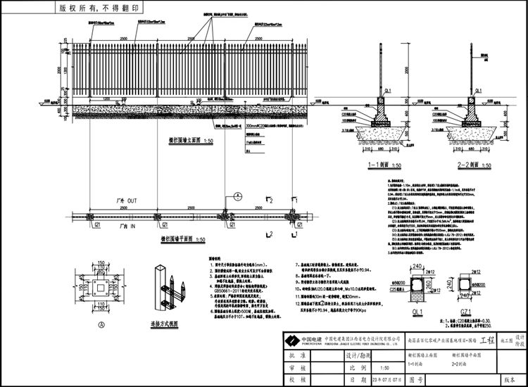6.栅栏围墙基础当填土深度>500时,基础应相应加深。基础地压力不小于10T,如遇不良地基,需换土处理。