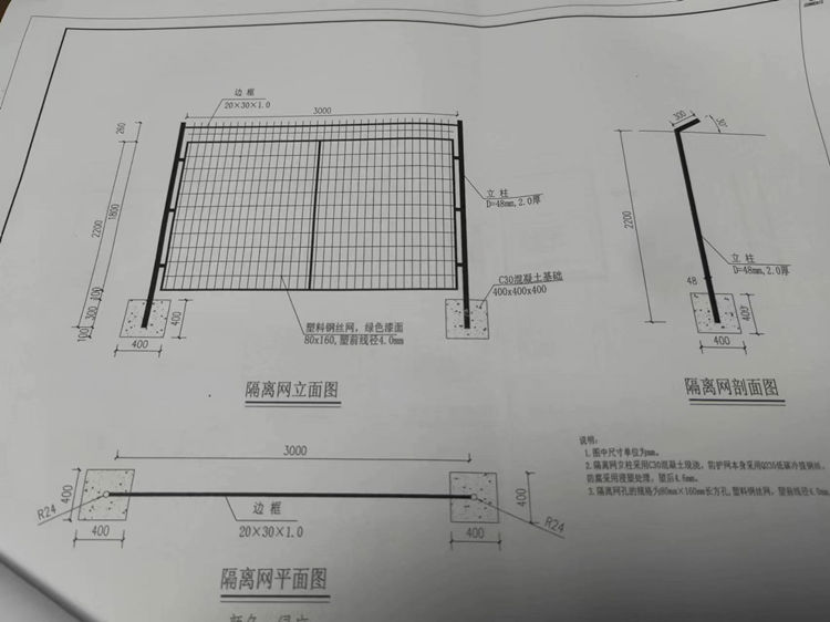 河源环境保护区浸塑隔离网专业生产厂家1、图中尺寸单位为mm。2、隔离网立柱采用C30混凝土浇筑,隔离网本身采用Q235低碳冷拔钢丝,防腐采用浸塑处理,塑后4.6mm。3、隔离网网孔规格为80*160mm长方孔,塑料钢丝网,塑前线径4.0mm。4、边框采用20*30矩形管,塑前厚度1.0mm。5、立柱外径48mm,塑前厚度2.0mm,立柱预埋水泥墩里面300mm。6、安装整体高度2.16米,立柱内边到内边间隔3.0米。