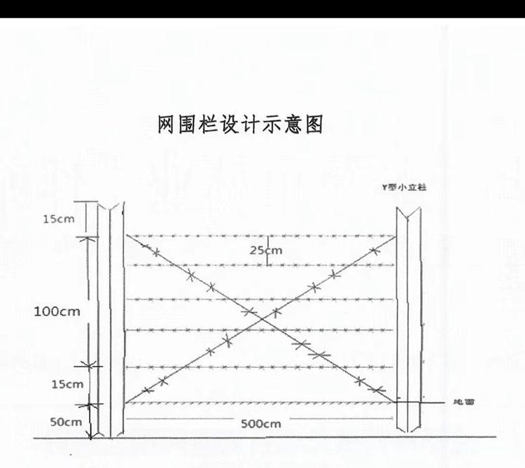 2、镀锌刺丝围栏使用七道刺丝(刺丝规格为带刺双丝合一,镀锌铁丝,单丝2.4mm,双丝4.8mm),其中五道横丝,两道X丝。刺间距小于6cm。 (见镀锌刺丝围栏设计示意图)
