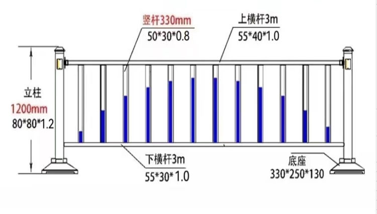 3.锌钢护栏横杆接口,圆弧形设计管件,使管件与接口衔接流畅稳固、便于安装,方管材质为锌钢(即镀锌钢管),立柱80*80-1.2,横杆55*40-1.0,竖杆50*30-0.8,底座为铸铁,铸铁重量不低于20公斤,底座设有地面安装固定孔口。