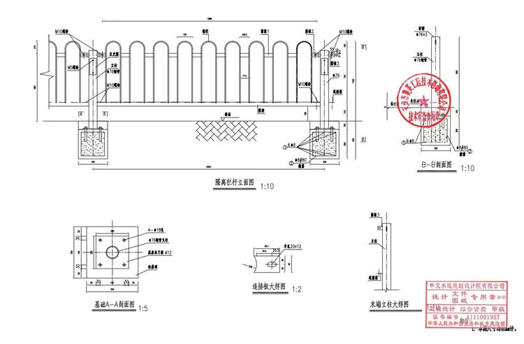 3、立柱和道路护栏分别成型:道路护栏采用圆钢、槽钢、扁钢焊接成型,道路护栏每2米为一个单元,底座与立柱焊接成整体。