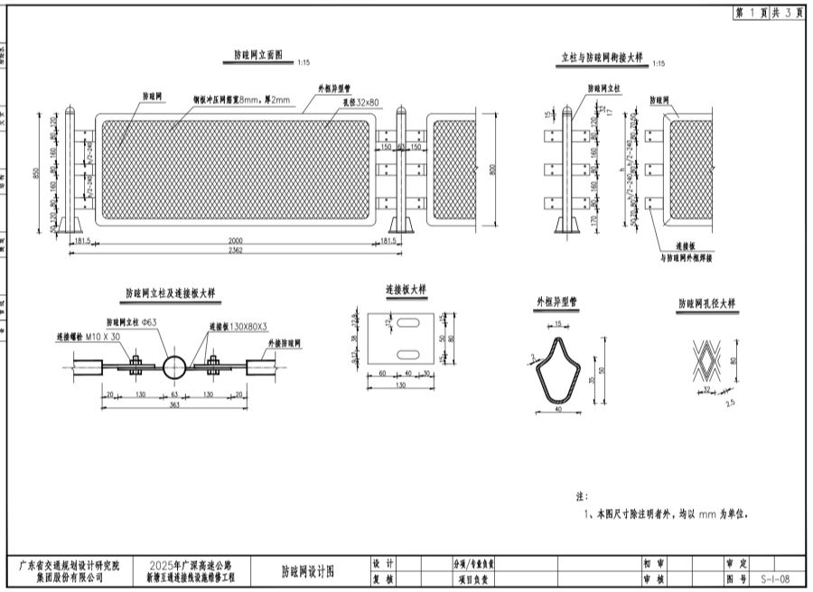 3、防眩网网与外框钢管焊接成整体结构。板材采用Q235低碳钢,冲压成型。螺检均采用8.8级大六角头高强螺栓采用防盗螺栓,M10X30螺栓采用全螺纹,头部高度为6.4mm。