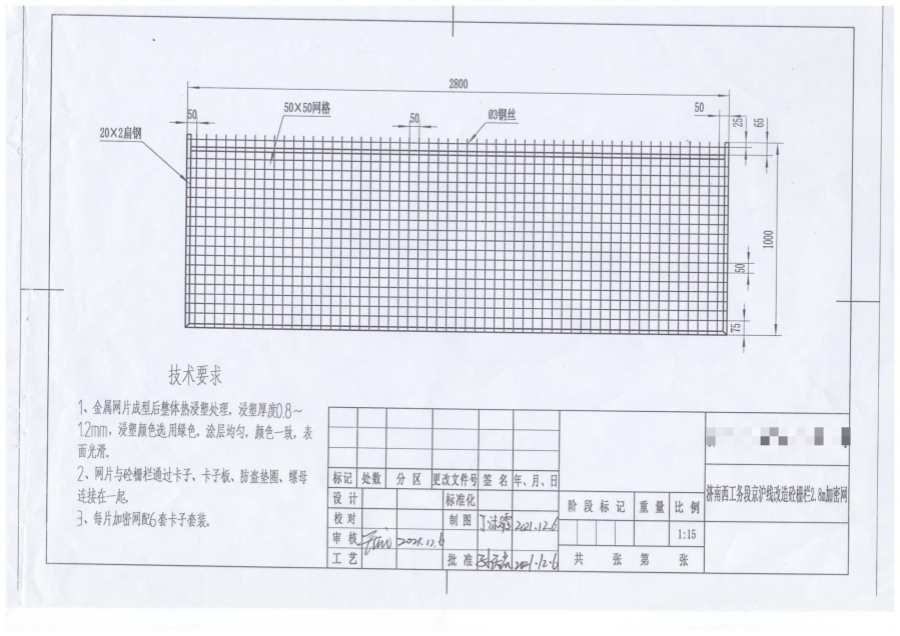1、金属网片成型后整体热浸塑处理,浸塑厚度0.8~1.2mm,浸塑颜色选用绿色,涂层均匀,颜色一致,表面光滑。