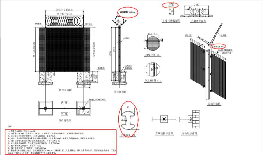 (2)围栏立柱中心距为2160mm,安装高度为2500mm,网格为76.2*12.7mm,立柱顶部设双曲臂,与水平方向成90°夹角,长度为566mm,表面热镀锌,镀锌量>275g/㎡,刺刀圈材质为热镀锌钢,直径为φ500mm。