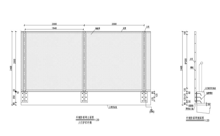 2、当防落网布置于人行道人行护栏外侧时,每隔2m预埋地脚螺和法兰盘,当防落网布置于车行道防