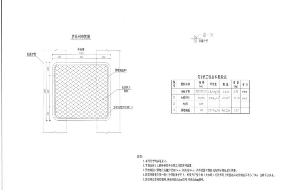 4.防落网设置在第一跨中分带防撞护烂上,长度为下穿公路(龙水路)的边界沿上跨桥走向向外制延长不小于10m,全桥合计26米。
