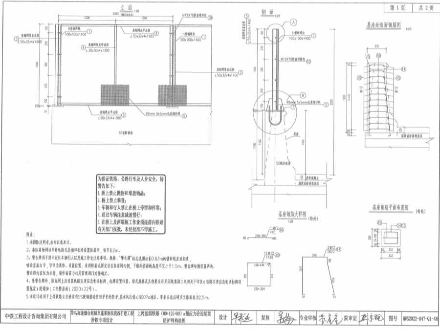 5、本设计适用于上跨铁路立交桥设有SS级钢筋防撞护栏的防护,基本风压值≤800Pa地区。要求安装后网顶至路面高为2.5m。