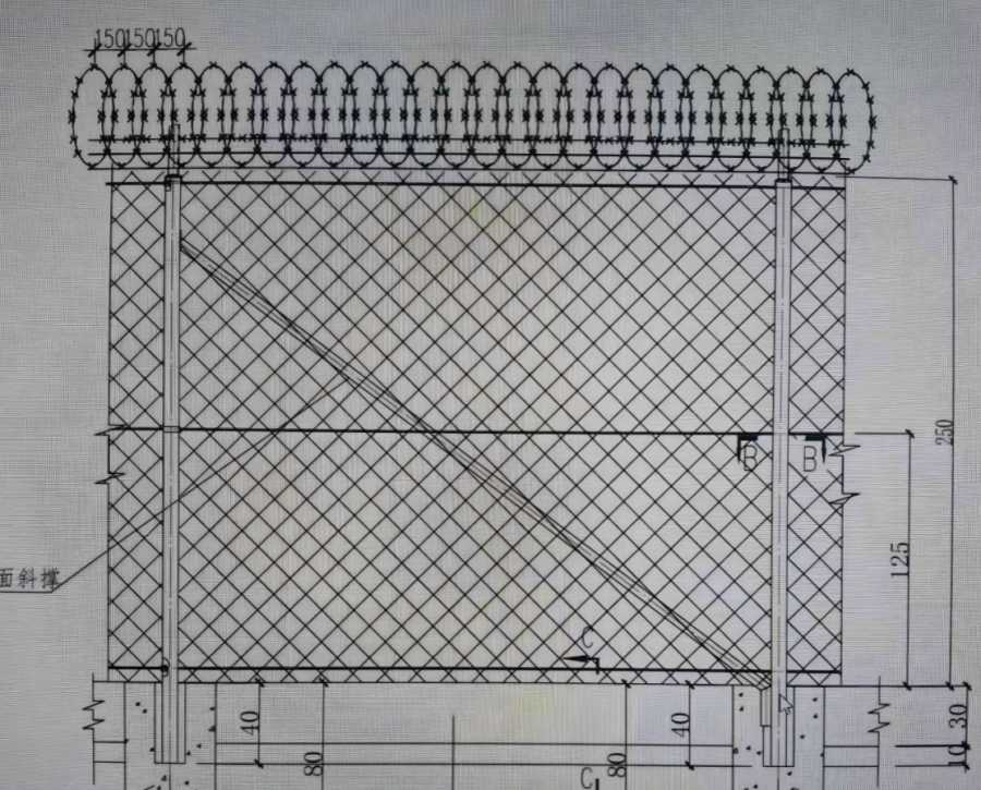 8、图中围界总高度为3.0m,立柱间距为30m,为确保围界安置后的稳固,要求每2个立柱设一道斜撑,转折处每个立柱设一道斜撑。