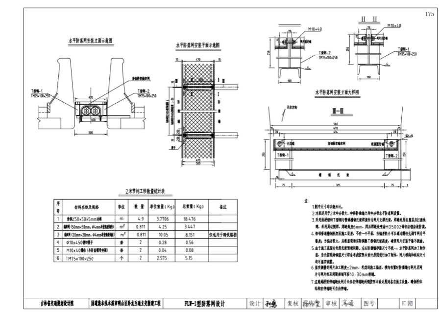 5.由于施工范图内的原托架预埋间距、左右防撞墙净距尺寸不统一,水平防落网加工制作前,务必按现场调查尺寸综合考虑按照本设计原则进行加工制作,网片横向和纵向尺寸均可据实调整。